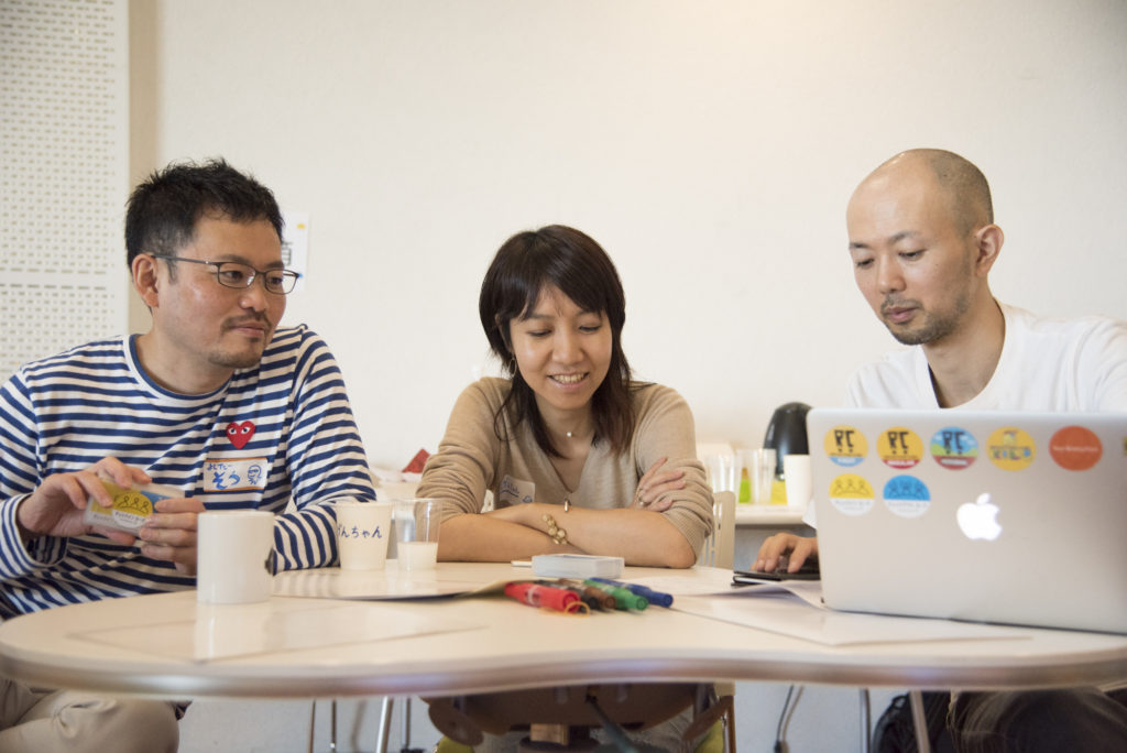 開発チームの3人。左からDialogic Consultingのそうさん、私、マナビクリエイトの中島さんです。