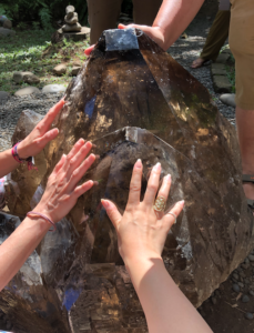 移動していくと、拓けたスペースに大きなクリスタルが。スモーキークオーツクリスタルで、このスクールの開校の記念にブラジルから運ばれてきたそうです。 この学校のエネルギー源でもあり、子どもたちも気持ちが高ぶった時にふとこのクリスタルに触れて落ち着く子もいるそう。