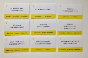 いろいろやってみて、会議にもチェックイン・チェックアウトを入れると良いなと実感しているのですが、会議でやる場合は頻度もあるため、問いかけにバリエーションがあるとやりやすい。