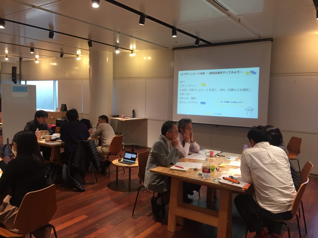 実際にカードを使って模擬会議をしてもらっているところです。