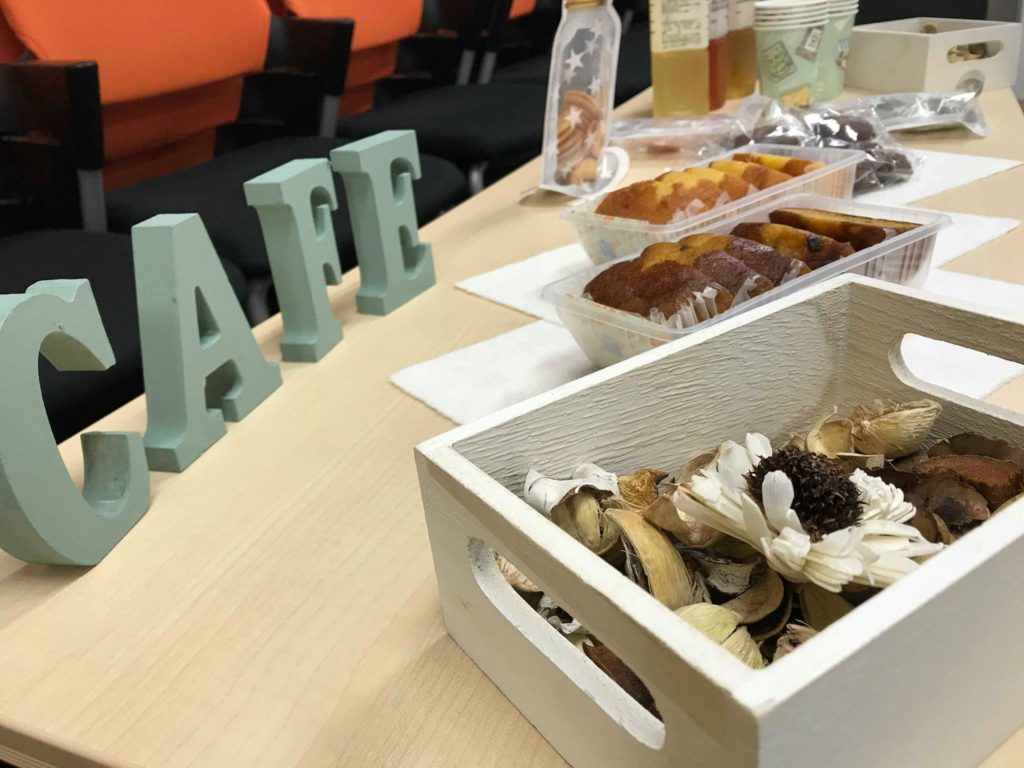 Cafeコーナーはこんな感じ。コンビニのお菓子じゃ味気ないし、かといって値段のするのは買えないし、、ということで今回は無印のお菓子を買って持っていきました。